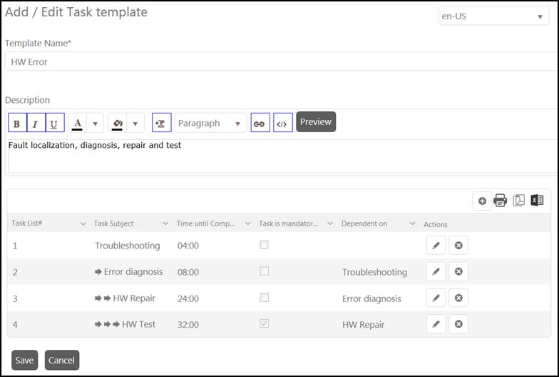 In the upper right corner a language dropdown list is displayed. If you want to save the Task Template in more than one language, input Template Name and Description for first language and click Save button. Then change language in the dropdown list and repeat for next language.