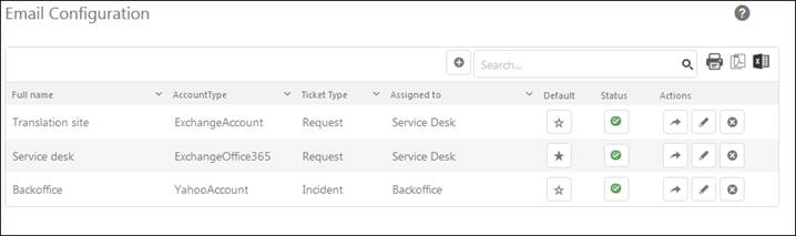 Email Configurations page mainly contains the list of configured email accounts. Functions for search, sort, filtering, print and export are similar to other lists in NSP, see section General User Interface.