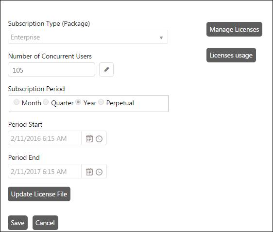 The License / Subscription tab contains the information about the current subscription activated. The information includes Subscription Type, Number of Concurrent Users, Subscription period, buttons to get or update License File and buttons to Manage Licenses and to display current License usage.