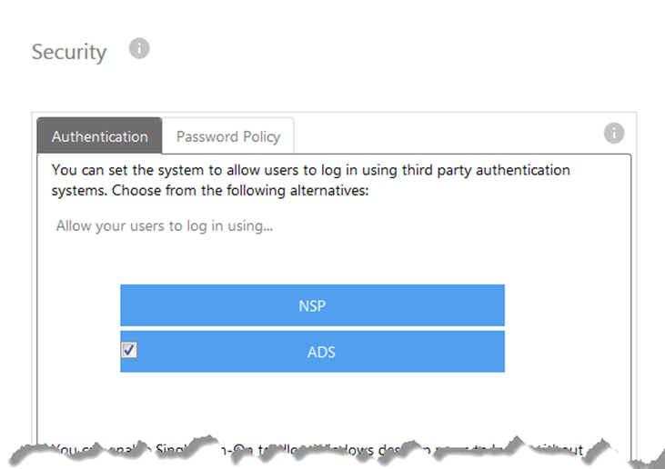 You can set up NSP to allow users to log in using authentication systems from Windows AD. The tab has a user interface with the login options listed and the AD option has a checkbox associated with it. The checkbox is used to enable or disable the Windows AD login option in NSP. Login using NSP Username and Password is always active, this selection cannot be disabled.