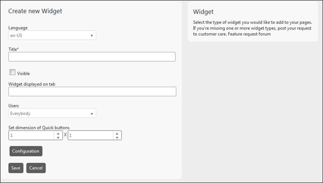 •Configuration: This button is shown only for Quick buttons widget. Opens a popup where you configure the Quick buttons. See Quick buttons configuration.