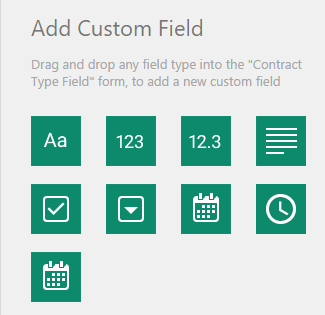 Custom properties can be added to Contract type from “Add custom field” panel. Here, new fields can be added, with following types: