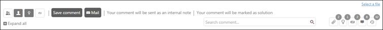 Four toggle buttons are provided beside search box: Show Attachment Comments Only, Show Mail Comments Only, Show solution comments only and Show workaround comments only. Only buttons having associated comments are displayed. For example, Show solution comments only button is displayed only if at least one comment is marked as a solution. Each toggle button also has associated badge displaying the respective comments count. When you click one of those buttons the comment list will be filtered and only comments matching respective button are displayed. Selected button´s color is changed. Click the same button again to inactivate the filter and show all comments again. |