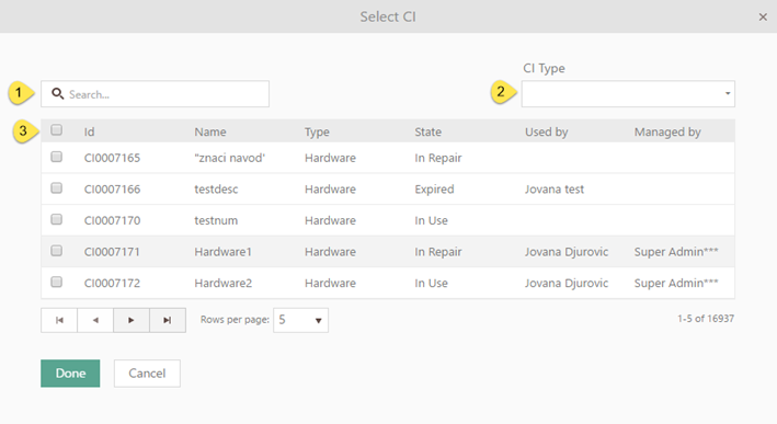 Select checkboxes (3) for CIs that should be attached. Click Done button, and selected Cis will appear in list of attached CIs.