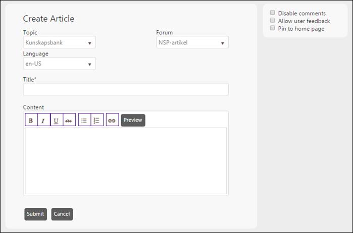To add a new Article to the Forum stream, click the add articles link provided for the forum stream when you mouse over it. The link opens the Create Article form: