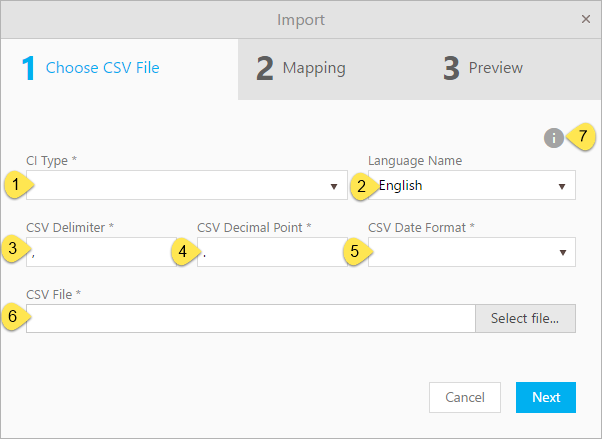 1. CI Type - Mandatory field. Choose CI type from dropdown list (the type that the CSV file contains data of).