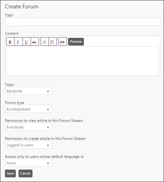 •Access only to users whose default language is: This option allows you to restrict access of the Forum Stream to users based on their properties. In this field a dropdown is available to allow access to users by their default language.