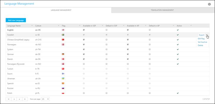 Rightmost on each row the list also contains a dropdown action for each language. Available actions are: Export, Edit flag, Set Inactive/Active and Delete.