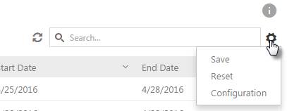 List Configuration is available on Configuration button in upper right corner of list. The configuration menu has three options: Save, Reset and Configuration: