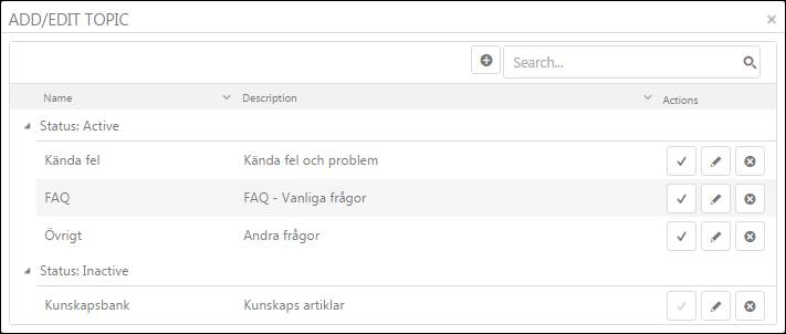 The list displays active topics followed by inactive ones. Each item in a list contains Name, Description and Action buttons Activate, Edit and Delete. Activate button is used to activate or deactivate the Topic. Only active topics are displayed in Forum. Edit button is used to edit the Topic information. The button opens Add/Edit Topic form in a popup with already filled information. Search, filtering and paging functions are also available here similar to other lists in NSP, see section General User Interface.