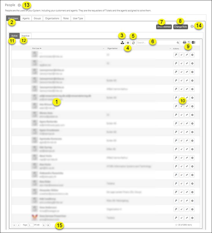 When you select People form, the list of End Users will be shown as default. Each user item in this list (1) contains the profile picture, name and email address, the organization name and Action buttons (10). The list is divided in two tabs, Active (11) and Inactive (12) users.