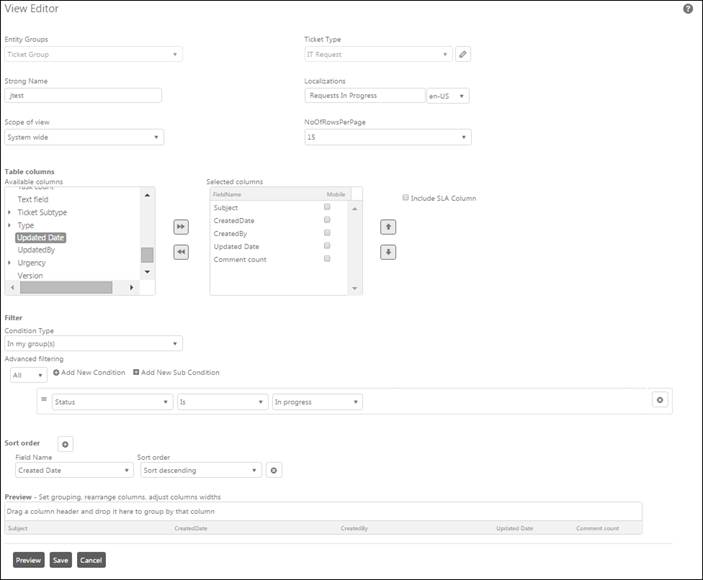 To test the content of the view based on the entered criteria, select Preview button.