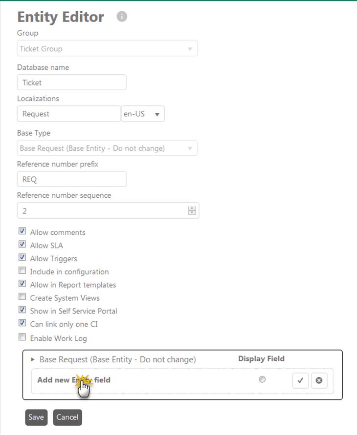 •Can link only one CI: This field is only available for the entities which base type is “Base Request”. If this option is enabled it is not possible to link more than one CI to a ticket of this type. If disabled you can link multiple CIs. Reason for this setting is ITIL rules, saying that for ticket of type Request or Incident only one CI can be attached and for Problem and Change ticket you can attach multiple CIs. This setting can override the ITIL basic rules. Default setting is according to ITIL rules.