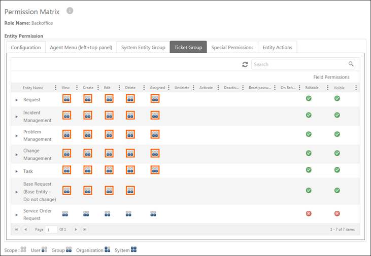 The Permission Matrix contains different tabs for active entity groups which are used to define role permissions access. Along with these tabs, there are two additional tabs: System Menu and Special Permissions which are used to define permission for system and configuration menu and define special function permissions for entity data, forms and views respectively. All these sections are described in following sections.