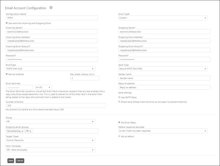 The form, Email Account Configuration is similar to that used to add email account (Add new record button). The only difference between these two forms is that you can define filters, Email rules in edit form. See below figure for Email Account Configuration Form: