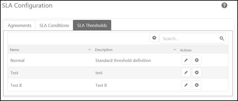 The SLA Threshold page contains the list of thresholds added to the system earlier. Each item in the list includes threshold Name, Description and Action buttons Edit and Delete.