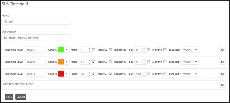 o Colors: Select color for the threshold level. This color is displayed with the SLA based on the stage in which the SLA is currently.