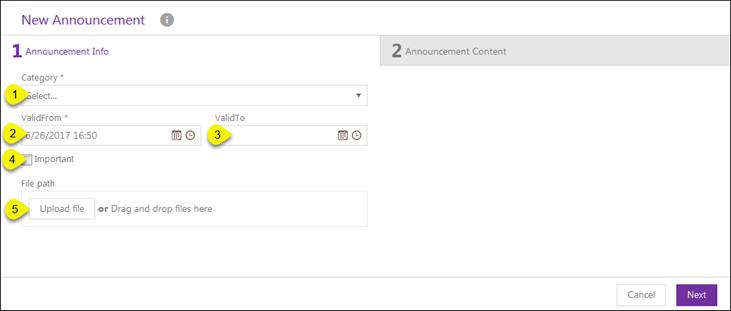 For adding new announcement just click on Add announcement button above the table. Adding new announcement is done in two steps.
