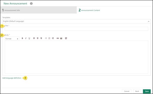 Use Save button to save created announcement, use Back button or click on Announcement Info tab to go to first step or use Cancel button to close the form and cancel announcement creation.