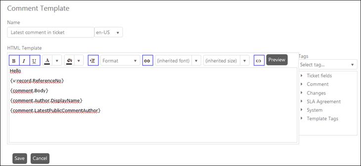 •HTML template: Enter the text for the comment in the given textbox. You can create different text for different languages by selecting the language in the language dropdown list displayed beside textbox of Name.