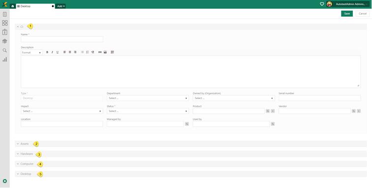 After selecting CI Type, you will get a list of default properties which need to be edited (the example below shows the form when CI Type Desktop has been selected, form includes properties for inherit CI Types Computer, Hardware and the default CI properties), because Desktop is a subtype of Computer is a subtype of Hardware.