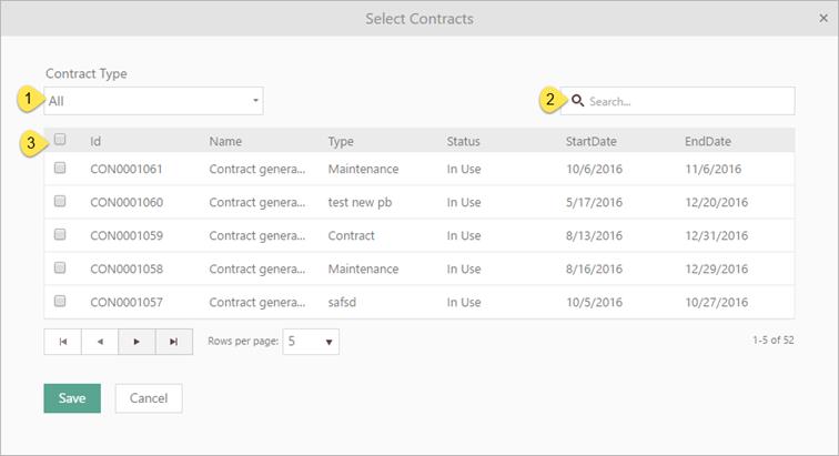 Contract can be searched by name (2) and/or be filtered by Contract Type (1). After choosing Contract Type table is filtered due to selected type.