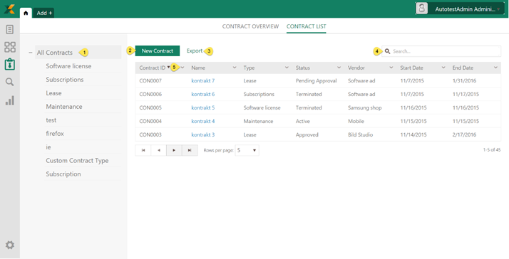 Panel on the left side (1) is used for selecting Contract types. After choosing contract type table is filtered due to selected type. Button for adding New Contract (2), is also changing due selected type. Adding new Contract functionality is explained in detail in Adding new Contract.