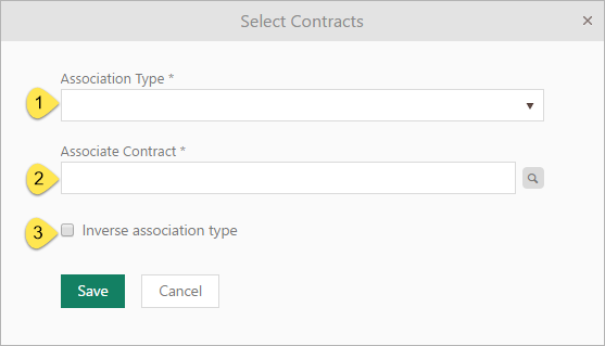 In the opened form you define association details, first you have to choose Association Type (1),required, which is dropdown field, and you can choose one of the Association Types defined in Contract Management (e g Renews – Renewed by).