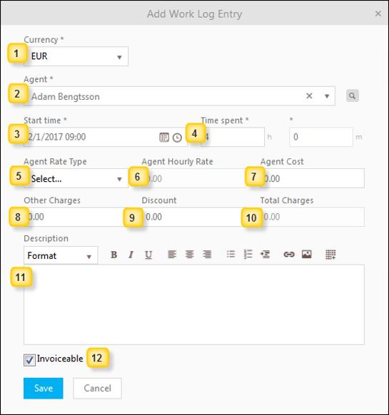 5. Agent Rate Type: Each Agent has an own set of Rate Types. The choice made here defines what hourly rate is going to be charged. Choose the type that correspond to the type of activity that is made. If there is a default Rate Type defined for the current Agent, for the current Currency, that type will be pre-selected in the form, and you have to change it only if other rate type than default should be used. This dropdown is updated when you change Agent (2) or Currency (1) in the form.