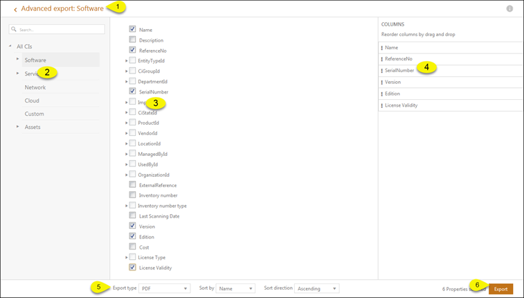 Note: Selection of CI Type in left panel (2) will not change which type of CIs to include in export. This selection only change which properties you can select. Which CI Type to be exported is already chosen in CI List and is displayed in Advance export Header (1).