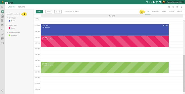 In the Left panel (1) of My Calendar are list of all calendar item types (Event, Leave and Availability). This list is used for filtering information in the calendar view. You can click the different calendar item types to show/do not show items of that type.