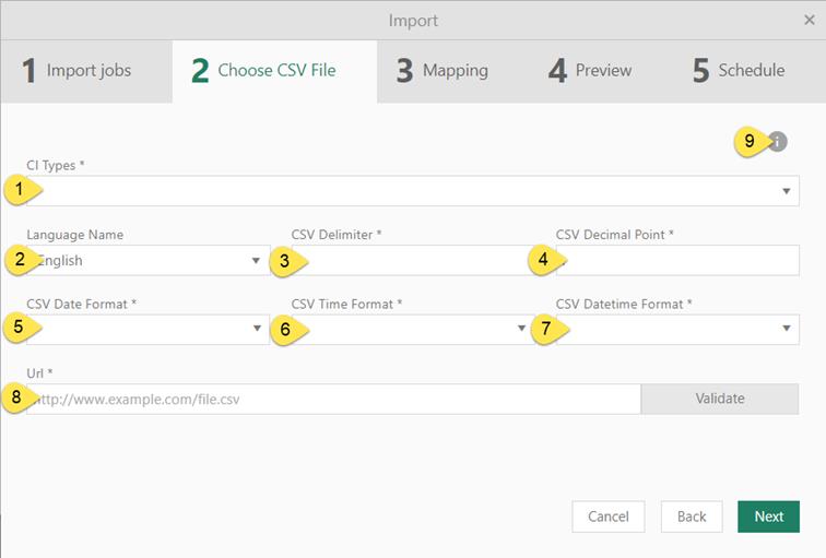 Second step will be the selection of the CI Type of the data contained in a CSV file as well as the selection of the file itself (path and filename):