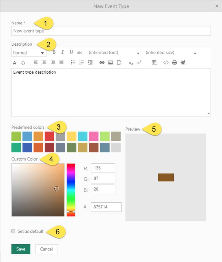 6. Set as default: Select this checkbox if you want to mark event type as default.