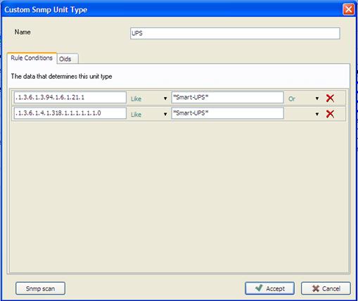 Example in Figure 3 shows a UPS unit type (uninterruptable power source), with Oid: .1.3.6.1.3.94.1.6.1.21.1 and value: *Smart-UPS*. Note that stars (*) i.e. wildcard, is always used with operator LIKE.