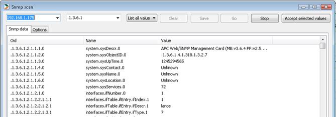 If you want to look after appropriate rows for identification on your units you can use a simple SNMP tool. Click on SNMP scan. State the IP address or network name in the field in upper left corner and click on GO.