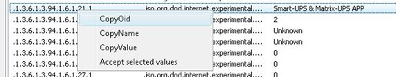 Here you can see all SNMP information for this unit. Find a suitable row for identification, right mouse click and choose Accept selected values, to use this row for identification. You can also copy/paste or manually type to add the value.