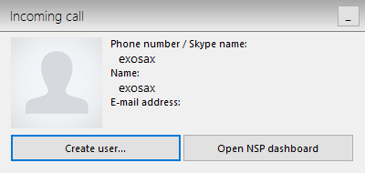 If the user does not exist in the registry hit the Create user… button. This opens add user form, and Phone/Skype name/Lync address field will be automatic filled with caller Phone number/Skype name value depending on the type of call.