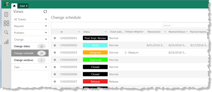 In the Ticket view “Change schedule” you can keep track of where in the workflow the different Change items are and when the test, implementation and release is due.