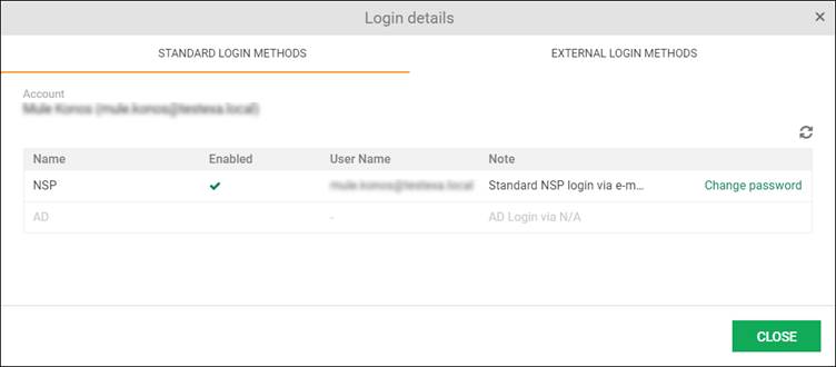 First tabs shows which login methods that is are available for the user, NSP and/or AD. Available login are marked in Enable column. For NSP login row contains a link to Change Password function.