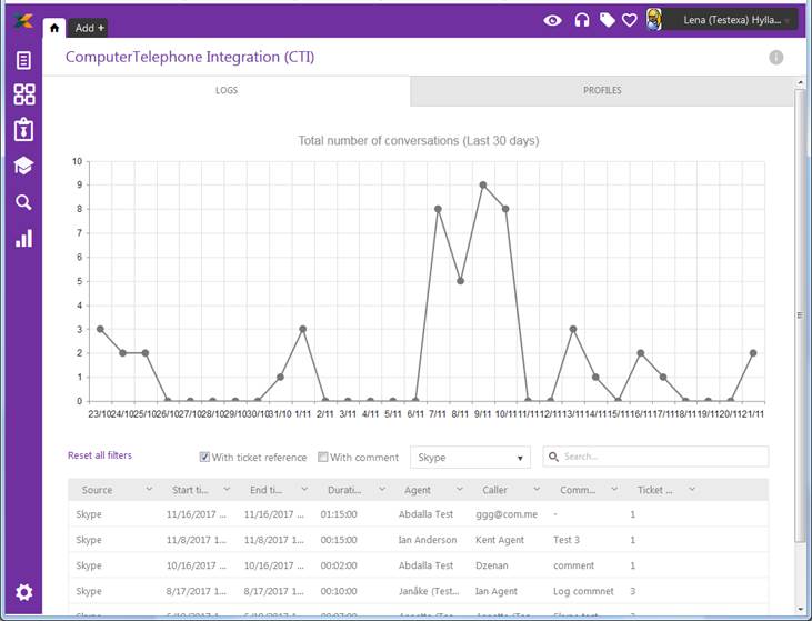 Clicking on the CTI icon in the upper right corner of the Agent interface will open a page with two tabs. One showing all call logs and the other Profiles for all users in the system, Agents as well as End Users.