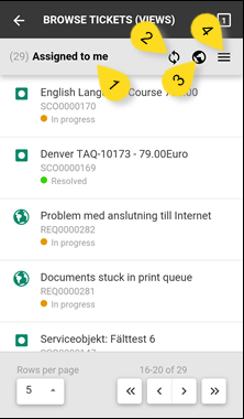 Tap on the Browse Tickets in the Tickets Main Page opens the screen showing a View (a filtered list of tickets). The first view in the list is displayed initially. Page shows a list of the tickets. For each ticket following fields are displayed: •Source Icon: The icon defines the source of the ticket, from where the ticket is originated. It can be System, Facebook, Email, etc. See Ticket Source Icons. •Ticket Subject •Ticket Id: Unique id for the ticket. •Status: A label with ticket status, shown as a colored circle followed by Status name. Above the list is a List Header (1) section that displays name of the currently displayed View. Refresh button (2) reads new data and updates the list. Map View button (3) shows locations on map. |