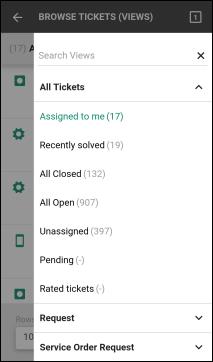 The content in Views menu is dynamic, available ticket filters in the list are defined by administrator in web interface. The Views are divided into different Ticket Types. You can expand/collapse the view list for each type by tapping the arrow symbol. Tap a view, then slide panel closes and ticket list filtered according to the view is displayed. If you want to close list without choosing a view, tap on header or in grey area to the left of the list. |
