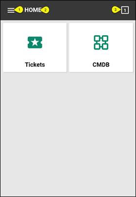 In Home page and in all other pages, except when form is displayed, application header contains Main Menu (1), header of current location in the application (2) and Tabs link (3) which display number of opened tabs. Home page is displayed after successful login. This is the prime interface for agents. From here you can browse the application. Home page contains Tickets and CMDB selections: Tickets – Tap this button to access the Ticket main page. CMDB – Tap to access the CMDB main page. Tab link You can always tap the Tab link in upper right corner to see a list of currently opened tabs. Number of open tabs are shown in the square symbol. Tap an item in list to go to that tab. Close a tab by tap the X. In User Profile you define maximum number of tabs that can be opened in the same time. |