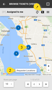 Map View and List View are using same paging function, shown at the bottom of the screen (4). This means, it will show only locations from tickets in same page. If you switch page in ticket list view, map view will show tickets in same page and vice versa.