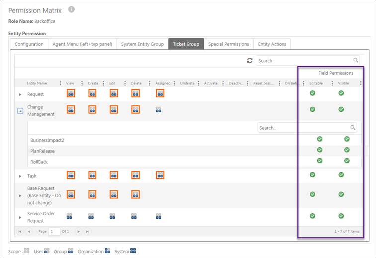 Permission Matrix, tab Ticket Group with all field permissions enabled