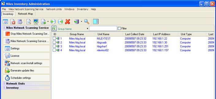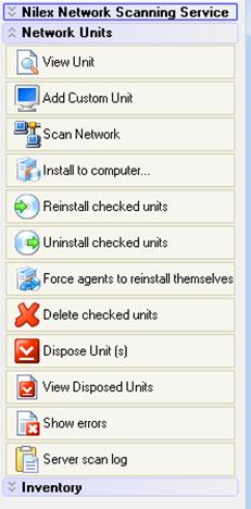 NNS console window consists of a list of units (now empty), a menu, a toolbar and a menu panel to the right. The menu options Nilex Network Scanning Service, Network Units and Inventory are all available in the menu panel for easy access.