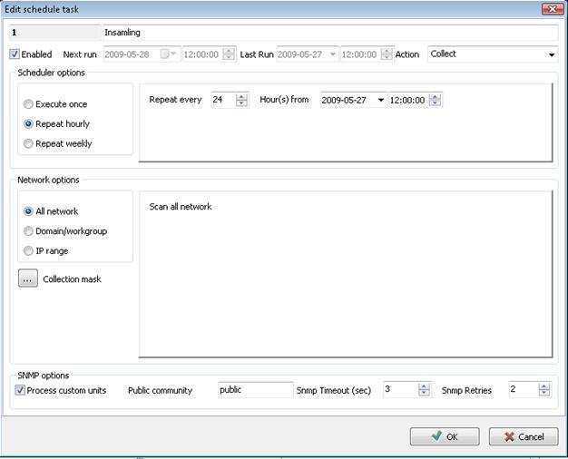 •Scheduler options - set at what times the task should be performed. You can create a scheduled collect for once or repeated times per hour and week.
