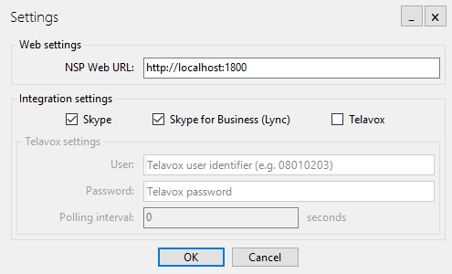 •Telavox- select this checkbox in case you use Telavox. If you enable Telavox option, Telavox settings will be enabled. In Telavox settings you need to set up User, Password and Polling interval.