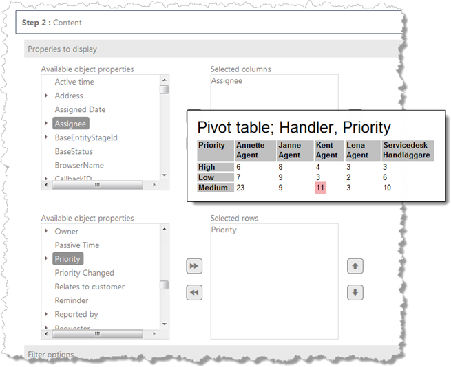 In the figure “Basic Pivot table” you can see that Agent “Kent” is assigned 11 tickets with priority “Medium”.