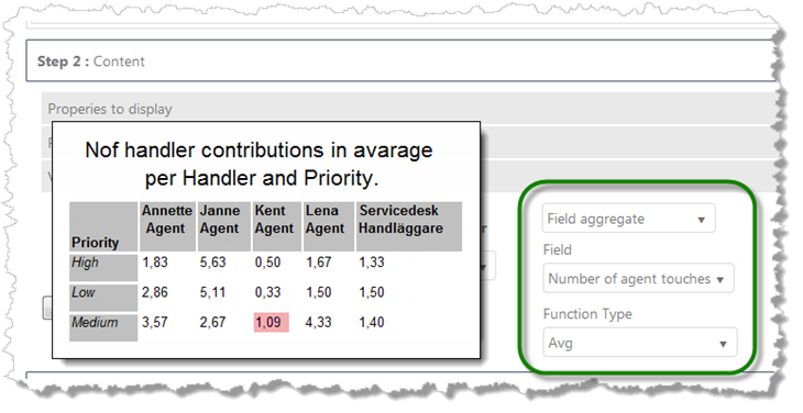 In the figure “Calculated values” below, shows a setting that creates a report where you can see that Agent “Kent” handles his tickets with Priority “Medium” in average 1.09 times.